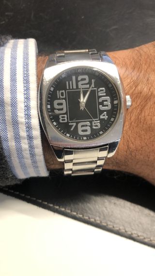 Reloj de Zara estilo 70's para hombre, de acero. Mecanismo de cuarzo, pila nueva, junta tórica nueva. Recién desmontado y limpiado con ultrasonidos. Está impoluto y funciona perfectamente. Algunas marcas de uso, tal y como se ve en las fotos.