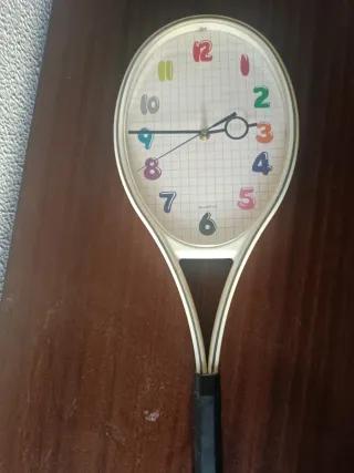 Original reloj con forma de raqueta de tenis, ideal para decorar cualquier espacio. - Diseño único y llamativo. - Marco blanco y números de colores.