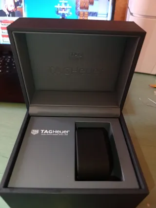 Caja original para guardar un reloj de la marca TAG Heuer. - Color negro con textura. - Logo de TAG Heuer en la tapa.