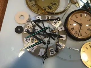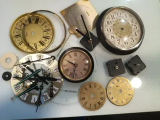 Lote de maquinaria para relojes a pilas y diversos accesorios. - Esferas de reloj doradas y con números romanos. - Agujas de reloj de diferentes tamaños y estilos. - Mecanismos de reloj. - Aro metálico para reloj.