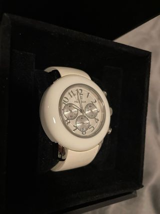 Reloj de pulsera de la marca Oxydo con una esfera blanca y detalles plateados. - Correa de material transparente. - Bisel plateado. - Tres subesferas en la esfera principal. Estuche con la tapadera superior rajada pero se puede usar.