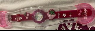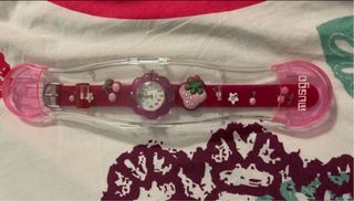 Reloj nuevo para niña con un diseño divertido y colorido. Viene precintado, listo para estrenar. - Correa de color rosa con adornos de fresas y cerezas. - Esfera con un marco morado en forma de flor. - Incluye una funda protectora transparente. Muchos más artículos en mi perfil. Descuentos por lotes.