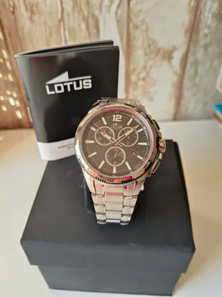Reloj de pulsera de la marca Lotus con esfera azul y detalles plateados. - Diseño deportivo y elegante. - Correa de metal. - Bisel giratorio.