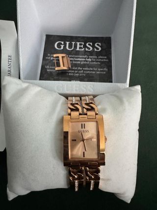 Elegante reloj de la marca Guess en tono dorado, con detalles de cristales brillantes en la esfera y la correa. - Diseño llamativo y sofisticado. - Correa metálica ajustable. - Caja original incluida.