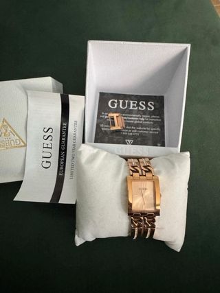 Elegante reloj de la marca Guess con un diseño moderno y sofisticado. - Caja y correa en tono dorado. - Esfera rectangular. - Detalles brillantes en la correa.