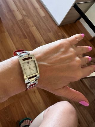 Elegante reloj de la marca Tous. - Diseño moderno con detalles dorados y rosas. - Caja original incluida.