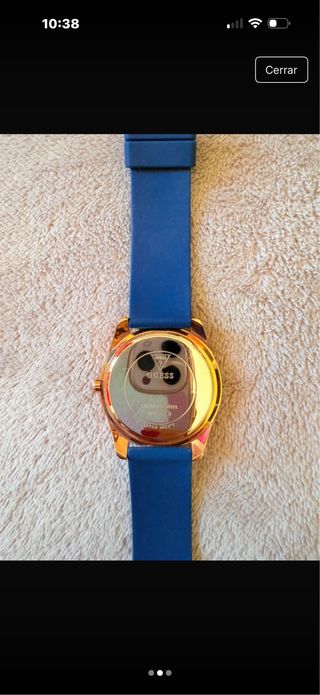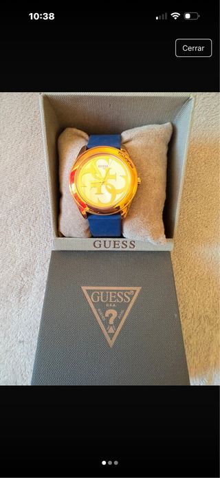 Elegante reloj de la marca Guess con un diseño moderno. - Correa de piel azul. - Caja dorada. - Esfera con detalle de logo. Pequeño detalle en la esfera como se ve en la última foto