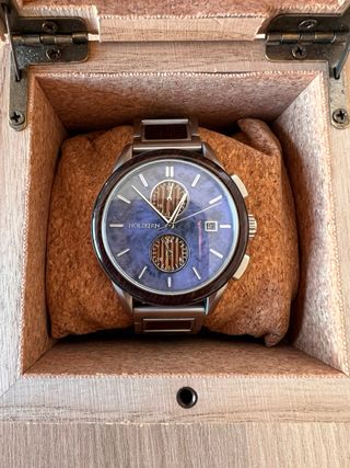 Elegante reloj de la marca Holzkern con detalles en azul y plateado. Presentado en una caja de madera con un grabado especial. - Diseño único. - Caja de madera con mensaje. - Estilo moderno.