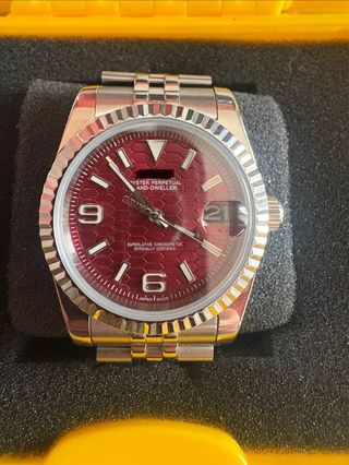 Reloj automático con movimiento NH35 MOD. Presenta una esfera de color rojo con un diseño texturizado. - Movimiento automático NH35. - Esfera de color rojo. - Diseño texturizado Panel de abeja -Homenaje a marca Japonesa S PREGUNTAME