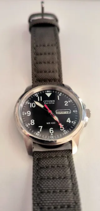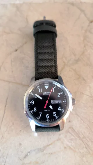 Vendo reloj Citizen Garrison BM8180-03E. Medidas de la caja: 37,2mm Estas en muy buenas condiciones. Tiene marcas de uso: Rayas en la caja y una en el cristal frontal (se aprecia en la primera foto). Funciona perfectamente y le quedan muchos años de uso. Es Eco-Drive (se carga con luz artificial o natural). Ideal como segundo reloj de batalla. Se vende con correa original nueva a estrenar ya puesta. Vendo por cambio a otro modelo. No negociable.