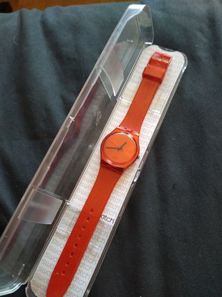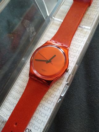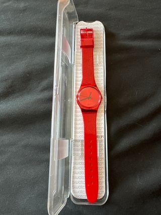 Modelo: SFR103 Reloj de la marca Swatch nuevo. De color rojo y Correa de goma con brillos. No se ha usado nunca y está tal cual se compró. Se vende por falta de uso. Resistente al agua. Incluye certificado de garantía de su compra.