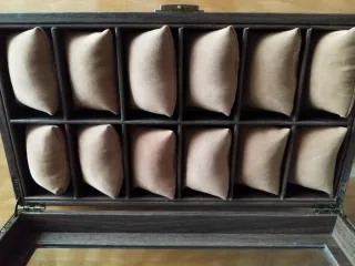 Elegante caja para guardar y exhibir relojes. Su diseño interior protege tus piezas. - Compartimentos acolchados para relojes. - Acabado exterior en tono marrón oscuro. - Tapa con ventana para visualización.