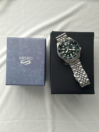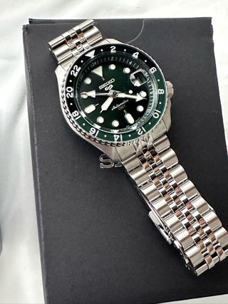 Reloj Seiko 5 Sports GMT con esfera verde y bisel bicolor verde y negro. El reloj se encuentra en muy buen estado y sin marcas de uso. - Caja de acero inoxidable. - Correa de acero inoxidable. - Bisel giratorio bidireccional.