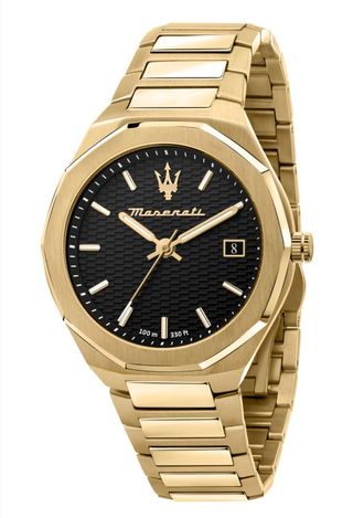 Descripció Rellotge de quarç Indicador de data Resistencia aigua: 10 ATM/100 m. Marca Maserati. Material: Cristall mineral revestiment de zafir Color: daurato i negre caixa: 42 x 42 x 9,1 mm corretja: 200-220 x 86 mm