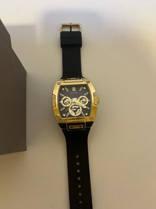 Elegante reloj de la marca Guess con un diseño moderno y llamativo. - Caja de color dorado. - Correa de silicona negra. - Esfera con detalles dorados.