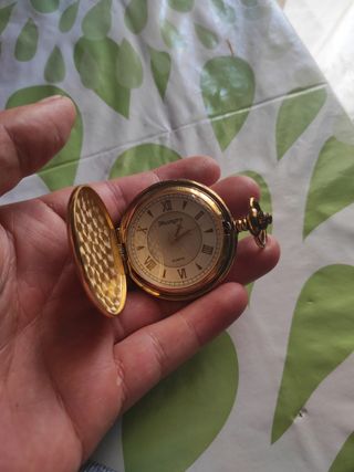 Precioso reloj de bolsillo de la marca Bhangra. Es de color dorado y tiene una apariencia elegante. - Mecanismo de cuarzo. - Esfera con números romanos. - Tapa con diseño grabado.