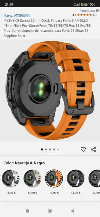 Correa de recambio para relojes Fenix, Epix, etc. - Cierre Quick Fit de 20/22mm. - Diseño deportivo. - Combinación de colores. Varios modelos a escoger. Artículos nuevos a estrenar. Solo entrega en mano. No cambios. Precio: 25% de descuento respecto de los precios marcados en los anuncios. (14€ - 25% = 10€). (15€ - 25% = 11€). (17€ - 25% = 13€). (20€ - 25% = 15€). (11,3€ - 25% = 8€).