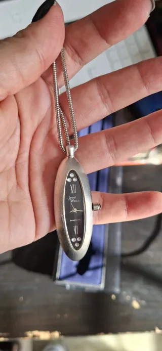 Elegante reloj colgante, con un diseño ovalado y cadena. Se trata de un reloj de cuarzo, tipo colgante/collar, de la colección Jewel Watch de Tompla Hachette. - Esfera negra con detalles plateados. - Cadena de eslabones plateada. - Presentado en su caja original.