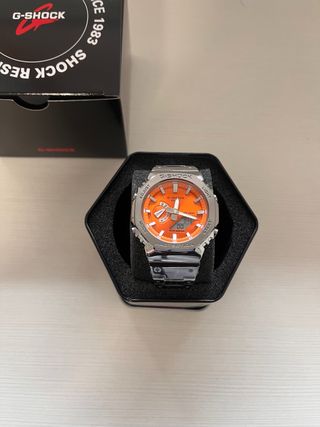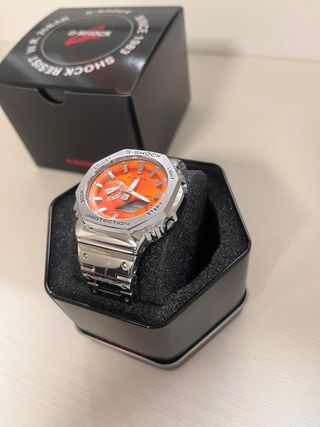 Reloj G-SHOCK con un llamativo diseño. - Esfera naranja. - Correa plateada. - Caja metálica hexagonal.