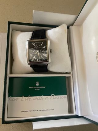 Elegante reloj de la marca Frederique Constant. - Caja rectangular. - Correa de piel negra. - Esfera con detalles plateados.