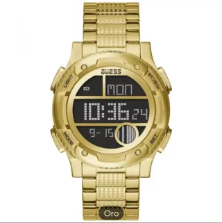 Reloj de pulsera de la marca Guess con acabado dorado y pantalla digital. Ideal para el día a día. - Diseño moderno y llamativo. - Funciones de alarma y cronómetro.