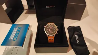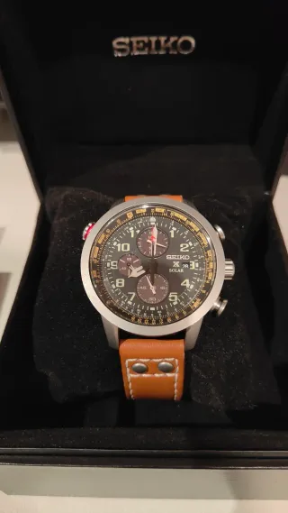 Reloj automático de la marca Seiko con una elegante correa de cuero marrón. Muy poco uso. Es solar. Se necesitan mas fotos, contactar sin problema. - Esfera con detalles en dorado. - Bisel con marcadores. - Cierre de hebilla.