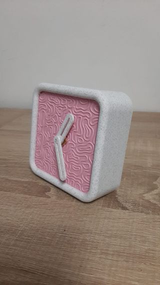 Reloj de mesa con un diseño orgánico y moderno. Su esfera cuadrada presenta un relieve texturizado que le da un toque único. - Marco exterior blanco moteado. - Esfera interior en relieve color rosa.