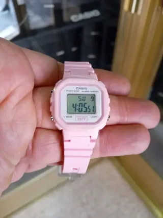 DIRECTO DE RELOJERIA, 2 AÑOS DE GARANTIA, ESPECIFICACIONES, Luz LED, Cronómetro – 1/100 seg. – 1 hora, Alarma diaria, Cristal acrílico, Caja de resina, Caja de resina, Correa de resina, Hebilla, 5 años – 1 pila, Clasificación de resistencia al agua (WR) según ISO 22810, Dimensiones (A x A x P) 34,5mm x 30,4mm x 8,6mm, Peso aprox. 16 g Estado Sin estrenar Marca CASIO COLLECTION Color ROSA