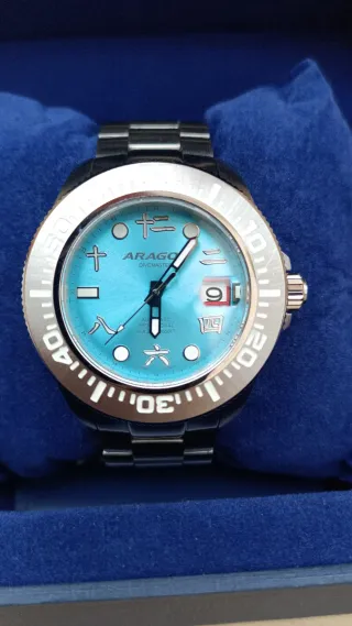 ARAGON DIVEMASTER II CHINESE CHARACTER Referencia: A334CHI (Divemaster II CC) Reloj diver contundente de línea tool-watch con dial “Chinese Character” y presencia muy marcada. Diseño pensado para quien busca tamaño y lectura incluso en condiciones exigentes Caja en acero inoxidable de 45 mm Cristal K1 (mineral endurecido) Bisel giratorio unidireccional con lumen en azul Esfera azul coral / Caribbean blue con numerales en caracteres chinos Indices con lumen (white lume que brilla en verde en los índices horarios) y fechador con lente magnificadora y marco en rojo Movimiento automático Seiko NH35 con fecha 200 metros