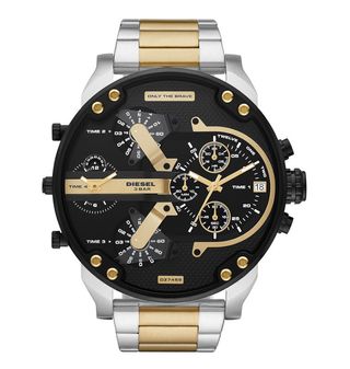 Reloj marca Diesel estilo Mr Daddy, referencia de Diesel DZ7459. Es nuevo, sin uso, conserva precintos de fábrica. Con caja y manual de instrucciones. Reloj de acero inoxidable con correa color acero gris y dorado. Esfera muy grande, 57 mm de diámetro. 4 husos horarios independientes. Fecha, cronómetro e indicador 12/24 horas. Resistente al agua 3 ATM (significa resistente a las salpicaduras de agua).