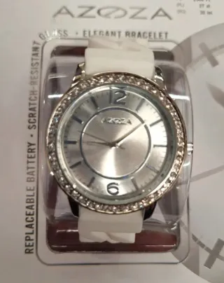 Elegante reloj de pulsera de la marca Azoza. Su diseño combina detalles plateados con una pulsera blanca. - Bisel adornado con pedrería. - Correa de silicona blanca. - Esfera plateada con números y marcadores. - Cristal resistente a los arañazos.