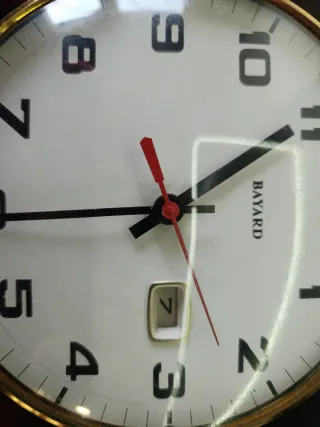 Reloj de pared con un diseño clásico y elegante. - Marco exterior en color dorado. - Caja principal en color negro. - Esfera blanca con números y manecillas. Tendría que arreglarse la maquinaria a pilas. De ahí su precio