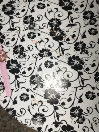 Conjunto de accesorios para mujer. - Reloj con correa rosa. - Colgante con detalles de corazón.