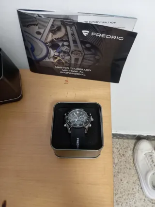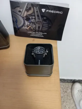 Elegante reloj Frederic Master Tourbillon Mecánico. - Diseño sofisticado en negro y plateado. - Correa de caucho con el nombre de la marca. - Presentado en su caja original.