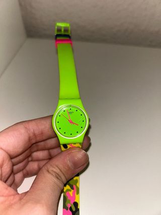 Reloj de la marca Swatch con un diseño llamativo. - Correa de silicona en color verde brillante. - Esfera verde con detalles en rosa. - Correa con estampado de camuflaje multicolor.