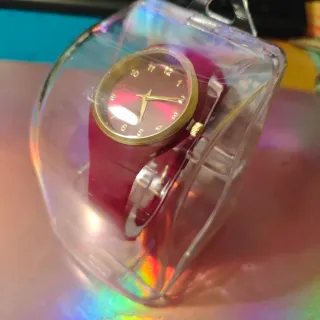 Reloj de la marca Calypso con un diseño moderno y llamativo. - Correa de color rosa. - Esfera con detalles dorados.