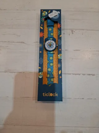 Reloj infantil de la marca Ticlock con un divertido diseño de despertador. - Correa de tela con estampado. - Esfera con números y manecillas. - Presentado en su caja original.