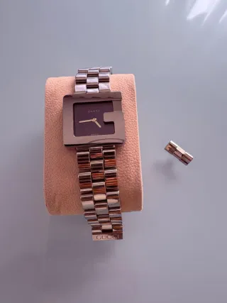 Elegante reloj de pulsera para mujer de la marca GUCCI con un diseño sofisticado. Está en buen estado y funcionando perfectamente. - Esfera cuadrada con detalles brillantes. - Correa de piel negra. - Acabado plateado.