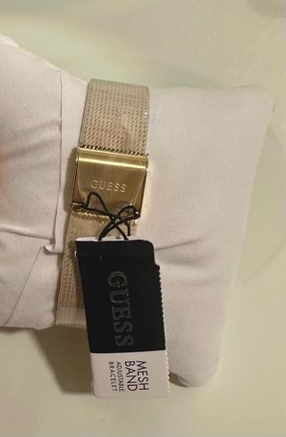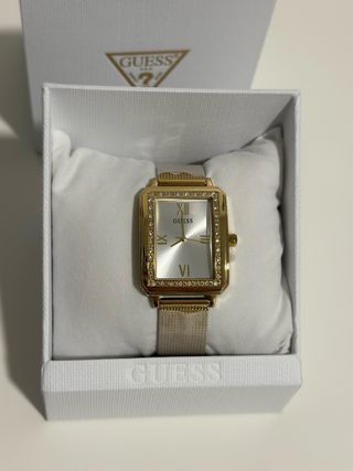Elegante reloj de la marca Guess con un diseño rectangular y detalles brillantes. - Modelo: Jane - Caja y detalles en tono dorado. - Bisel adornado con pequeñas piedras. - Correa: 19 cm - Resistencia al agua: 3 ATM - Peso: 57g - Nuevo sin usar, en su caja