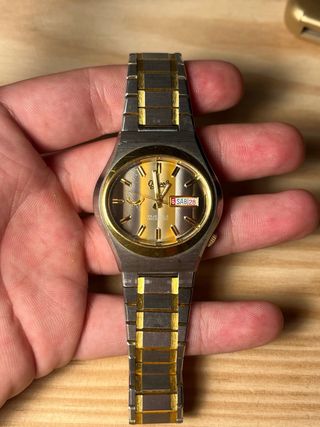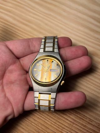 Vendo espectacular reloj suizo vintage Ogival Fisk de los años 70. Una pieza de colección con un diseño retro bitono (acero y tono dorado) que es pura tendencia. Detalles principales: • Movimiento: Automático suizo (25 rubíes). Maquinaria muy limpia y funcionando a la perfección. • Esfera: Precioso dial degradado con el icónico logo del pez en relieve y doble calendario a las 3. • Brazalete: Conserva su armis original integrado con el cierre firmado con el logo de la marca (algo muy raro de encontrar). • Caja: Acero inoxidable con protección Incabloc y antimagnético.