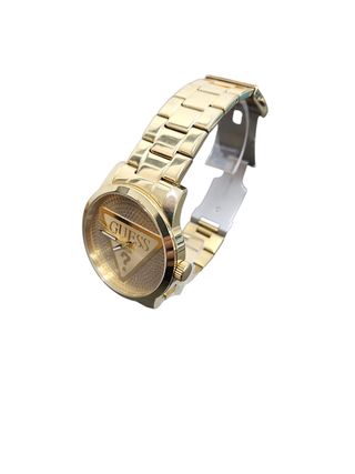 Elegante reloj de Guess con un diseño llamativo y lleno de brillo. - Bisel y pulsera adornados con cristales. - Esfera dorada con el logo de la marca. - Pulsera de eslabones dorados.