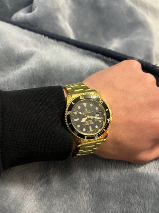 Elegante reloj Invicta Pro Diver con detalles en oro y bisel verde. - Caja y brazalete en tono dorado. - Bisel giratorio con marcadores verdes. - Esfera oscura con subesferas.