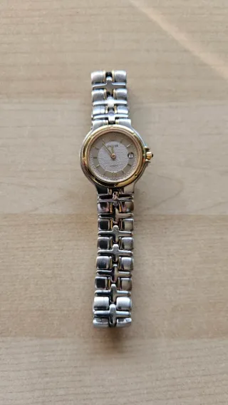 Elegante reloj de la prestigiosa marca, con un diseño bicolor que combina oro y plata. - Esfera con números romanos. - Brazalete de eslabones. - Corona con piedra azul.