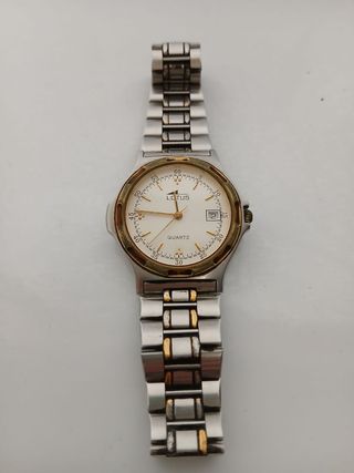 Elegante reloj Lotus con un diseño bicolor que combina tonos dorados y plateados. Brazalete: Acero inoxidable en acabado bicolor (plata y oro), muy resistente y con cierre de seguridad. Funciones: Incluye ventana de fecha a las 3 en punto para mayor practicidad. Movimiento: Cuarzo japonés de alta precisión. Estado: En buen estado de conservación. Se puede enviar o recoger en Tienda Solidaria Piel de Mariposa BARCELONA C/ Torrent de l'olla 100 (+ info en la última foto)