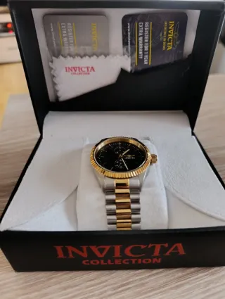 Reloj Invicta para hombre, sin estrenar y en su caja original. - Diseño elegante con detalles en oro y plata. - Incluye tarjetas de garantía y limpieza.