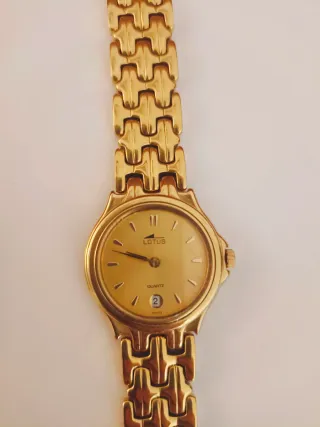 Elegante reloj Lotus para mujer de acero inoxidable con un acabado bañado en oro y cierre de seguridad de hebilla. La caja del reloj mide 39-42mm. Un accesorio clásico y sofisticado. Es resistente al agua. Muy elegante, adecuado para ocasiones formales, pero también combina muy bien con un estilo casual para el día a día. Muy versátil. Te envío también un trocito de correa que quité para que lo puedas adaptar a tu muñeca.