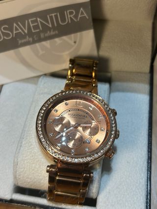 Elegante reloj de mujer de la marca Musaventura, a estrenar. Su diseño combina el color oro rosa con detalles de circonitas. Tiene todos los plastificados porque esta a estrenar. - Bisel adornado con circonitas. - Esfera en tono oro rosa. - Brazalete a juego. Con caja e instrucciones originales.