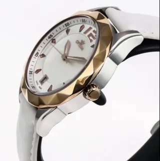 Elegante reloj de pulsera para mujer de la marca Minister, modelo Prestige. Combina tonos dorados y plateados en su diseño. - Bisel adornado con pequeñas piedras. - Esfera blanca con detalles dorados. - Brazalete metálico con eslabones curvos.