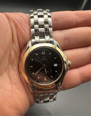 Omega Seamaster 120 Quartz original Reloj suizo original Omega con movimiento de cuarzo. Caja de acero inoxidable con bisel bicolor (acabado dorado chapado). Brazalete original Omega de acero con detalles dorados chapados. Esfera negra con fechador a las 3. Diámetro aprox. 36–38 mm sin corona. Funcionando correctamente. Modelo clásico y elegante de los años 90.