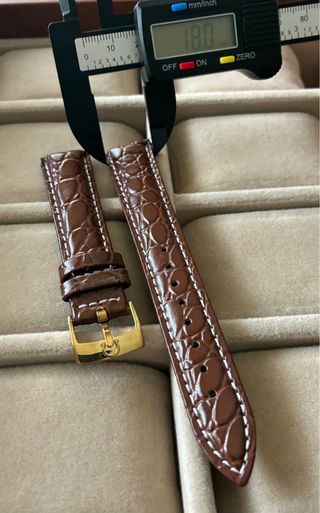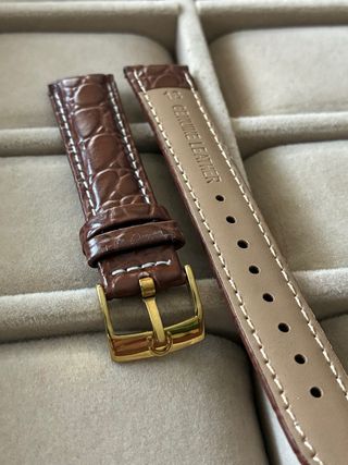 Correa de reloj en piel de becerro con un diseño elegante y acabado texturizado en cocodrilo - Material: Piel de becerro - Costuras blancas. - Hebilla en acero oro - Juego de pasadores nuevos (3)